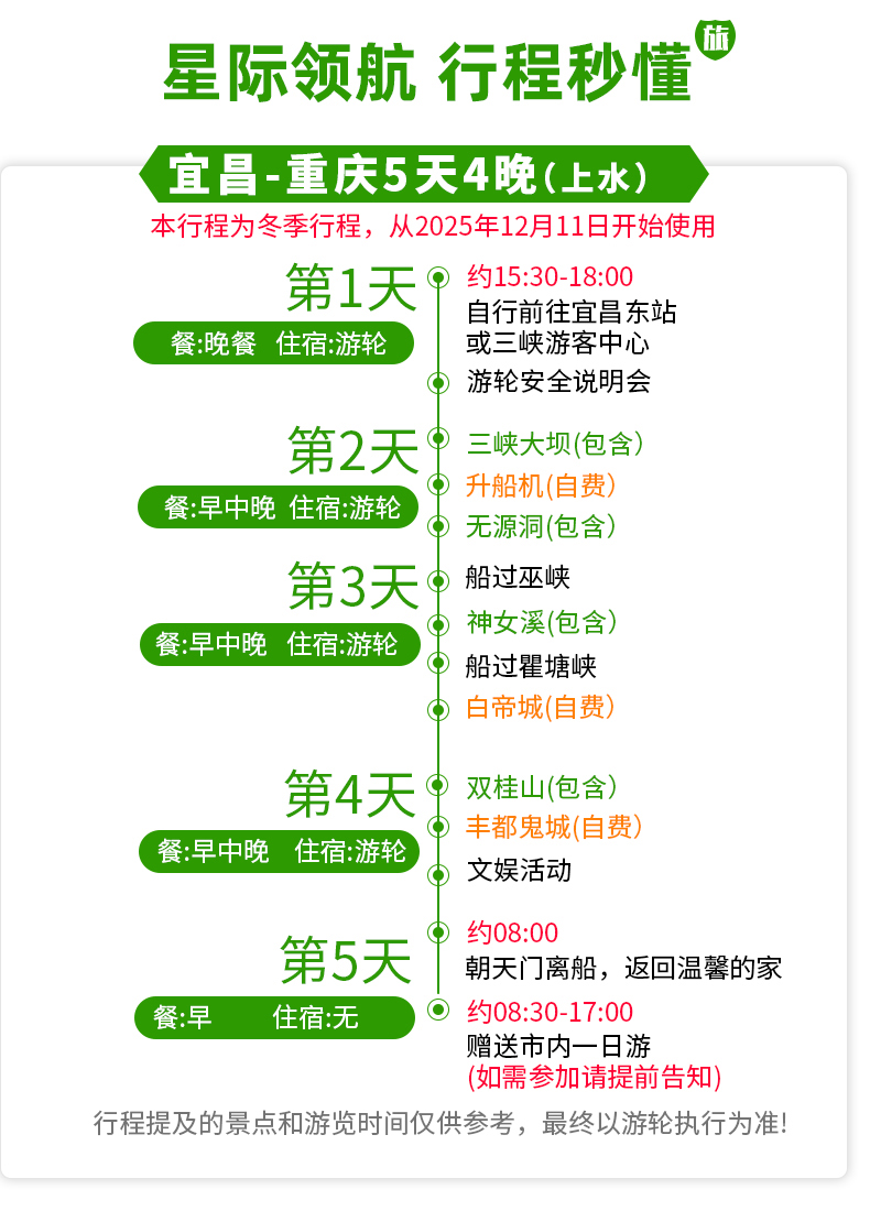 由于天气、水位、航道管制、港口通航等不可抗力因素影响,我司有权对所停靠码头、行程景点进行调整。敬请以该航次开航后船方通知为准。如出现这种情况,船公司将负责重庆市区至港口间的运转交通。