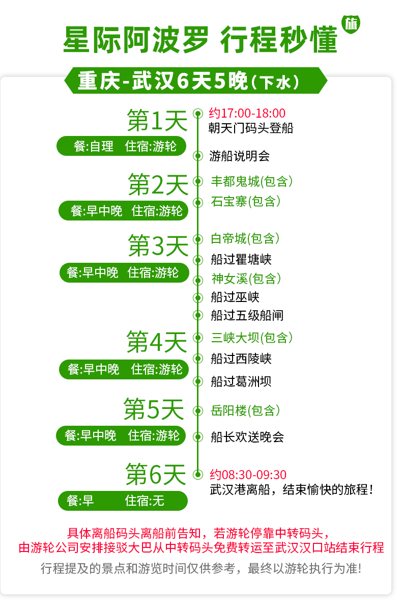 2、上行程为参考行程,最终游览景点、停靠码头及抵离时间等以船方实际安排为准。